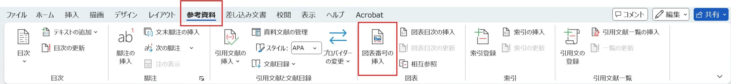 - リボンの[参考資料]タブ → [図表番号の挿入]をクリック
