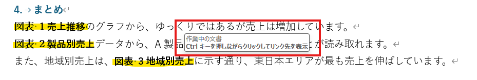 また、図表番号を設定すると、文章中に相互参照の機能を使い、参照して欲しい場所として設定することができます。